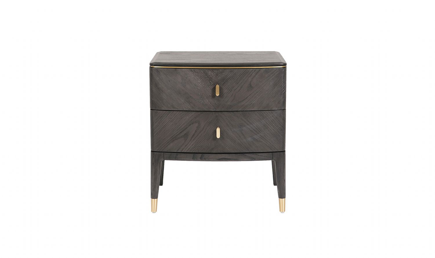 Add a sophisticated presence to your bedroom with this beautifully crafted two-drawer bedside table finished in rich ebony brown. Inspired by classic Art Deco silhouettes, this luxurious piece is designed with meticulous attention to detail. The ribbed drawer fronts bring depth and character, while hand-laid ash wood veneers arranged in an elegant V-matched pattern create a truly bespoke finish. Brushed gold inlay and slimline handles complete the refined look, delivering a statement piece that feels both timeless and modern. With two smooth-gliding drawers, there’s ample space to organise daily essentials, from makeup to jewellery and accessories. Whether paired with a coordinating stool or styled beneath a mirror, this bedside table elevates your space with its indulgent aesthetic and functional storage. Its modern proportions and striking finish make it ideal for contemporary or classic interiors alike.
