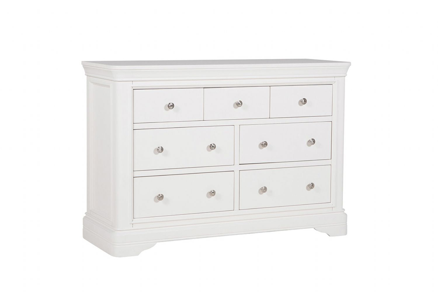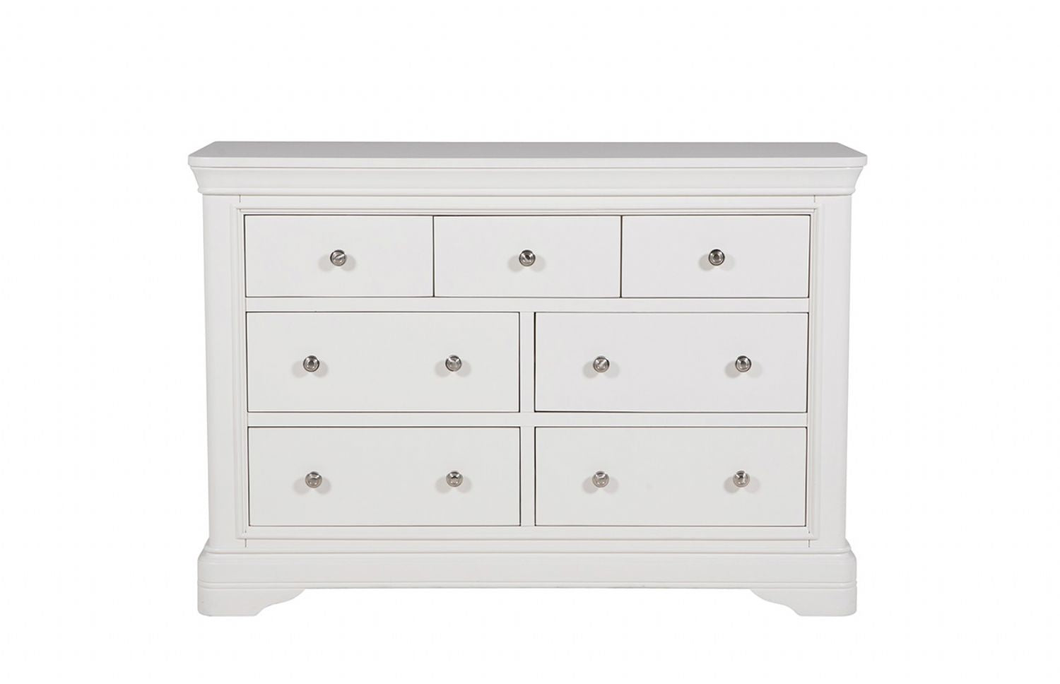 Bring sophistication to your bedroom with this 7 Drawer Chest of Drawers in Bone White, a registered design combining timeless elegance and ample storage. This sophisticated piece features a smooth, painted matte finish, creating a sleek, refined look that effortlessly enhances any decor. Polished silver handles add a touch of luxury, while classic decorative moulding and graceful curves bring an air of vintage charm. Crafted from high quality MDF and pine, this chest of drawers is designed to be both durable and stylish. With seven spacious drawers, it offers plenty of storage to keep your essentials organised while maintaining a clutter free bedroom. Finished in a soft bone white colour, this chest is the perfect blend of function and style, ideal for those seeking both practicality and beauty in their furniture.