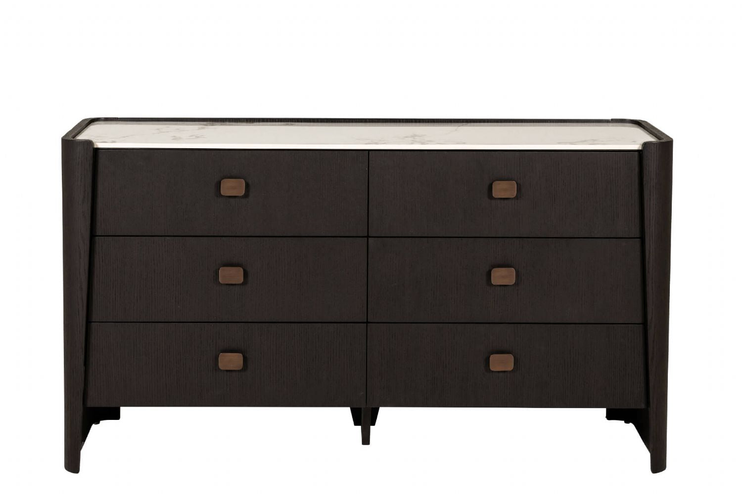 Elevate your bedroom with the Rhodes Dressing Chest 6 Drawer in a luxurious ebony finish, the ultimate statement of elegance and function. This beautifully designed chest brings modern refinement to any room with its sleek lines and superior craftsmanship. The richly toned brown exterior is complemented by stunning copper metal handles, delivering a modern twist to a timeless silhouette. Designed with both beauty and resilience in mind, the sintered stone top is resistant to stains and scratches, offering effortless maintenance for busy lifestyles. The chest features six spacious drawers to neatly organise clothing and essentials, combining high end luxury with everyday practicality. Perfect for master bedrooms or sophisticated guest spaces, this chest of drawers becomes a standout piece that effortlessly enhances your decor.