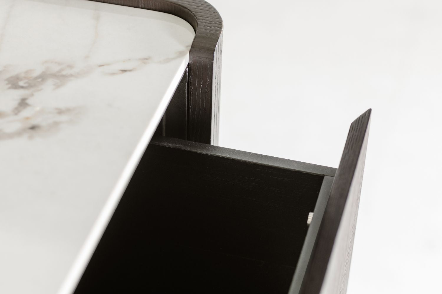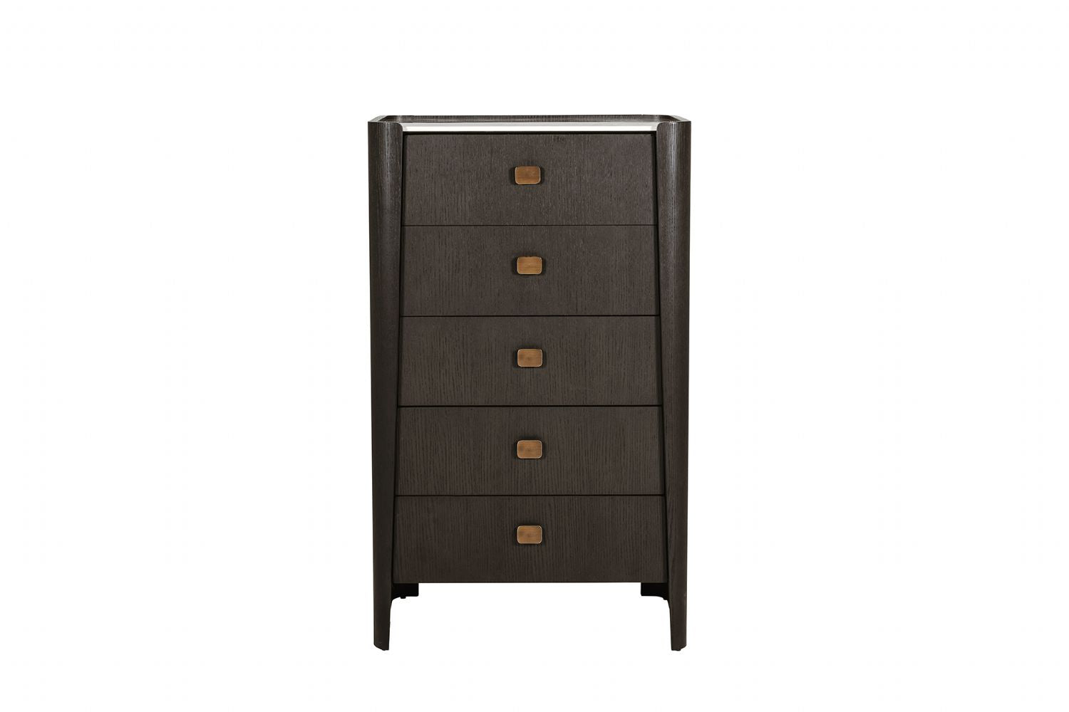 Elevate your bedroom with the Rhodes Dressing Tall Chest 5 Drawer in a luxurious ebony finish, the ultimate statement of elegance and function. This beautifully designed chest brings modern refinement to any room with its sleek lines and superior craftsmanship. The richly toned brown exterior is complemented by stunning copper metal handles, delivering a modern twist to a timeless silhouette. Designed with both beauty and resilience in mind, the sintered stone top is resistant to stains and scratches, offering effortless maintenance for busy lifestyles. The chest features five spacious drawers to neatly organise clothing and essentials, combining high end luxury with everyday practicality. Perfect for master bedrooms or sophisticated guest spaces, this tall chest of 5 drawers becomes a standout piece that effortlessly enhances your decor.