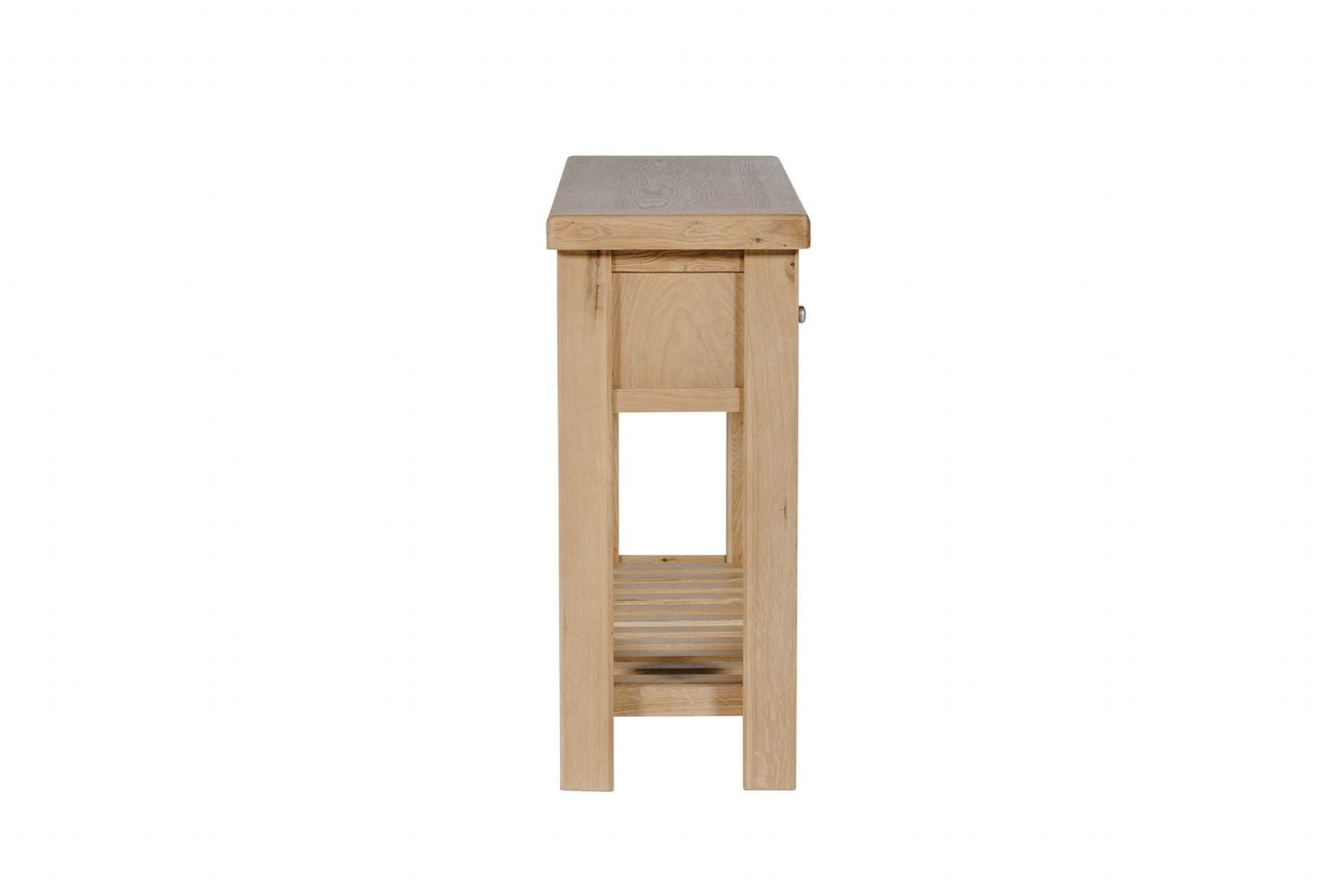 Enhance your hallway or entrance space with the Natural Oak Console Table with 2 Drawers. This beautifully crafted table blends classic styling with practical design, making it a timeless addition to any modern home. Built from a combination of solid oak, oak veneer and pine, it delivers lasting durability with a refined finish. The natural wood tones and brushed metal handles offer a warm, elegant touch, while the two spacious drawers provide practical storage for daily essentials. Its slender profile and smooth edges make it perfect for narrow spaces without compromising on visual appeal. Whether used to display decorative pieces or keep clutter organised, this console table balances function with style effortlessly.
