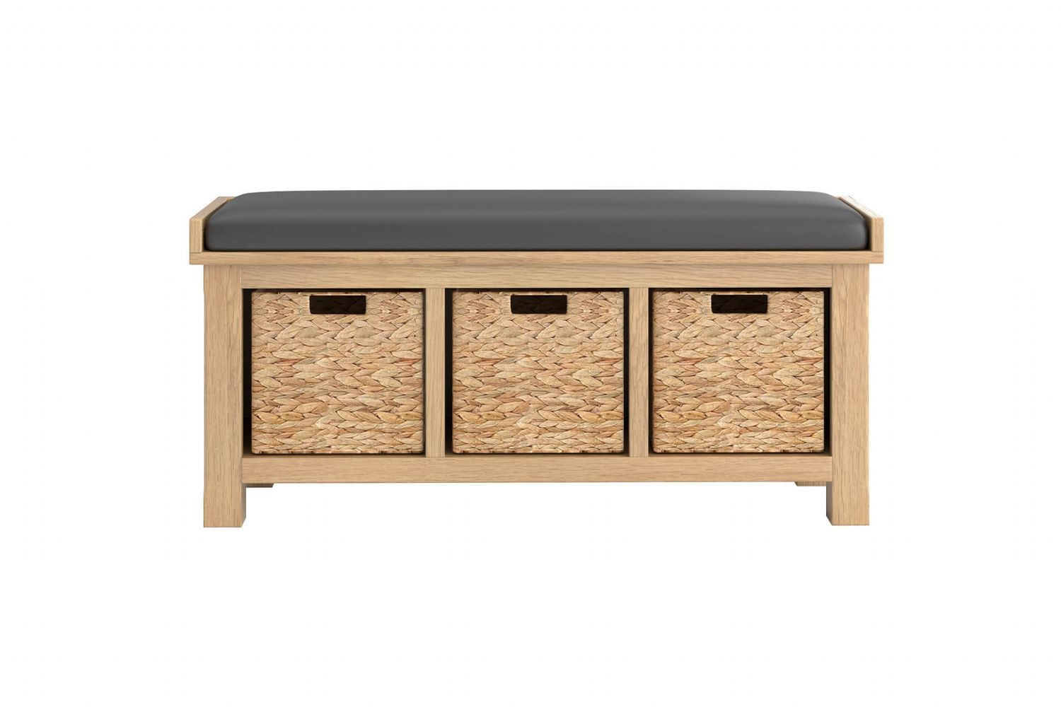 Delaney Bench Seat with Fabric Cushion with Storage in Dark Grey combines classic design with practical functionality. Built on a solid wooden frame, it features woven storage baskets and a water-repellent PU cushioned seat pad for added comfort and durability. Perfect for hallways or utility spaces, its traditional style and clever storage make it a versatile addition to any home.