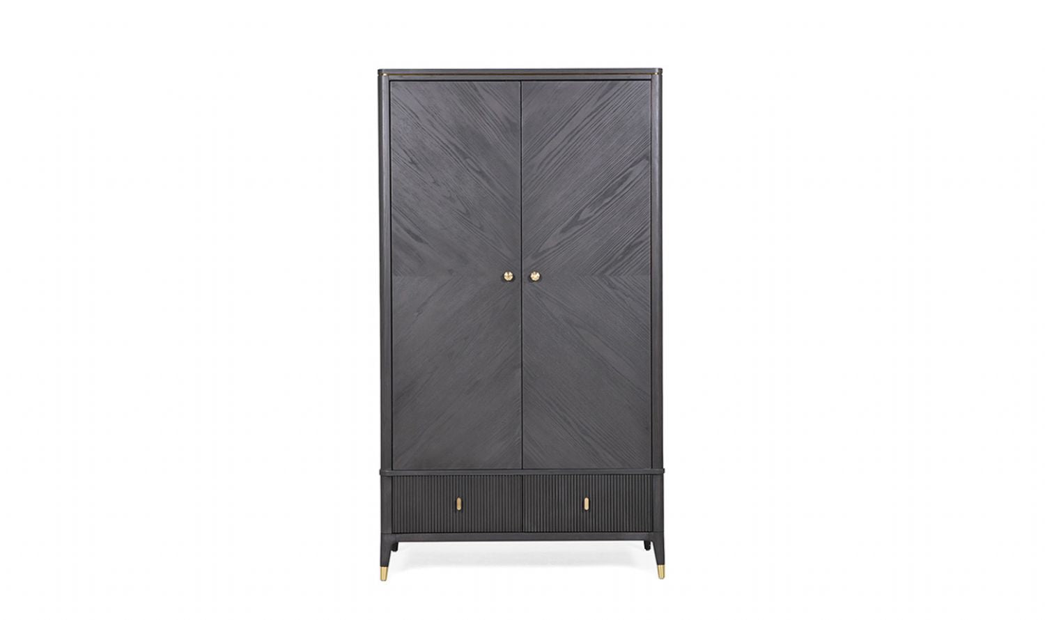 Full of presence, this stunning 2 door double wardrobe is traditionally designed with spacious features to maintain a well-organised and tidy arrangement. Designed with a unique ribbed effect in a stunning ebony finish with gold inlay, the wardrobe gives a statement appeal to your whole room. The small gold tip legs add a touch of charm and elegance to its look. The designer drawer fonts and matching handles further enhance its style. It features two doors and two drawers in an emphatic finish. The wardrobe features a metal hanging rail, offering the perfect solution to store your clothes. Two large drawers at the bottom allow for tidying folded clothing. The wardrobe is thoughtfully designed to maximize space and offers generous storage capacity, and its unique style enhances the beauty of your bedroom.